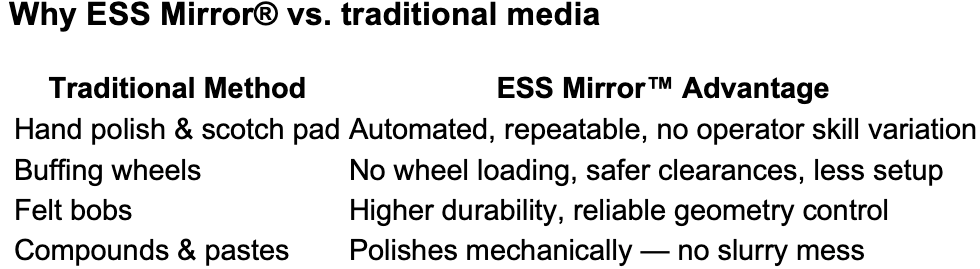 Where abrasive brushes remove burrs, ESS Mirror™ refines and perfects surfaces — delivering a mirror-like finish on metals and engineered materials.