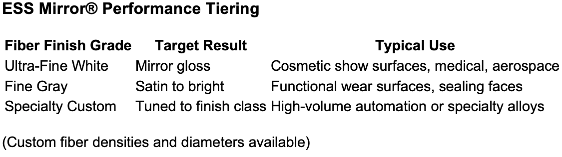 ESS Mirror™ tools are engineered for ultra-precision polishing and finishing on CNC machines, robotics, and automated equipment. Built from high-density, ultra-fine ceramic fiber filaments, Mirror™ tools produce a uniform, high-gloss surface finish while preserving geometry, edge detail, and dimensional accuracy.